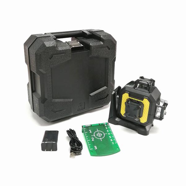 3D Laser level with integrated magnetic bracket, green target, charger, Type-C charging cable, manual, plastic carry case